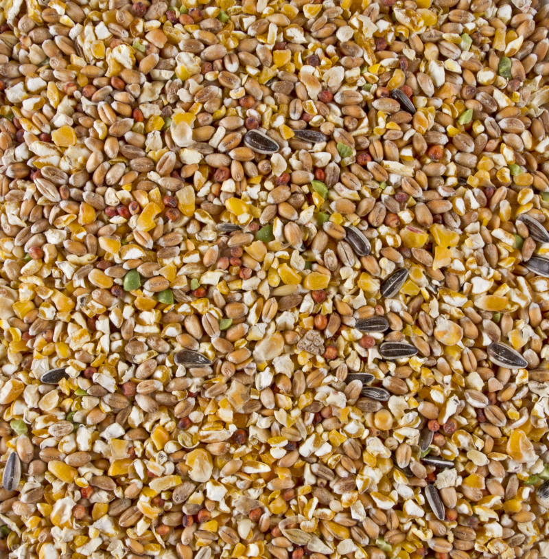 Enthält gebrochenen Mais und eine Auswahl an energie- und eiweißreichen Getreidesorten und Samen, wie z. B. Weizen, Milo-Korn, gebrochene grüne Erbsen, Sonnenblumenkerne und Cardi-Körner.